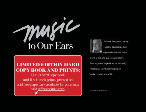 For over forty years, Jeffrey Heinke%u2019s illustrations have captured musicians in the world of pen and ink. His caricatures have appeared in publications nationally, sharing his talent and imagination to the creative side of life.%u00a92023 JEFFREY HEINKEto Our EarsLIMITED EDITION HARD COPY BOOK AND PRINTS:13 x 10 hard copy book and 11 x 14 inch prints, printed on acid free paper, are available for purchase. visit jeffreyheinke.com